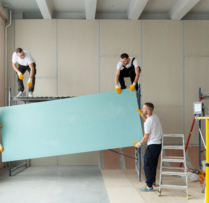 Spécialistes des travaux de plâtrerie, nous créons et embellissons vos espaces avec élégance : pose de cloisons, doublages, faux plafonds, isolation thermique et acoustique.